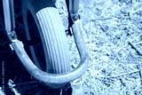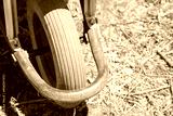 close-up of a yellow and green wheelbarrow wheel, work tool concept