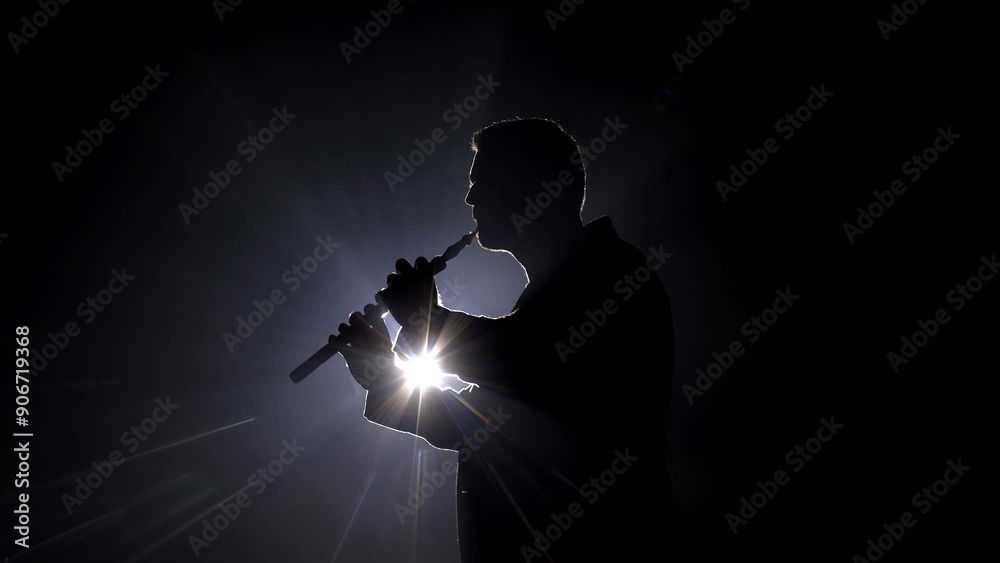 Silhouette of a man with a horn under stage lights. A striking image perfect for promoting live performances, musical events, and dramatic stage moments.