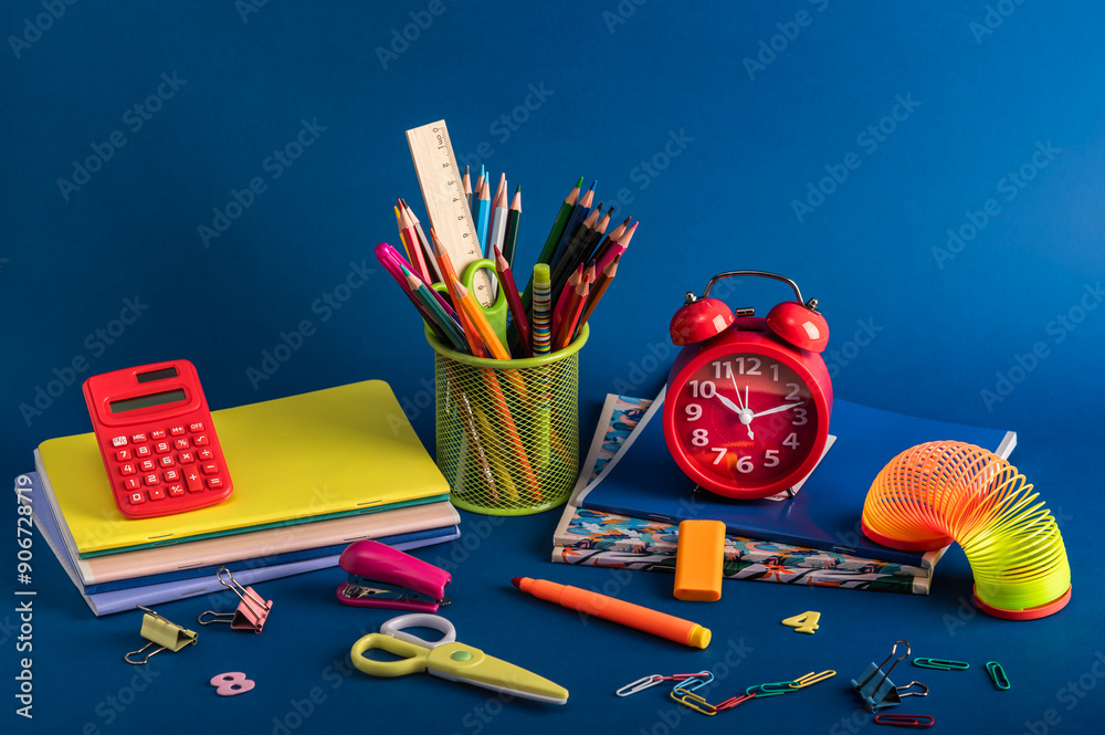 Stationery, notebooks, red alarm clock and red calculator on blue background. Back to school concept.
