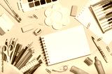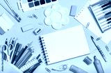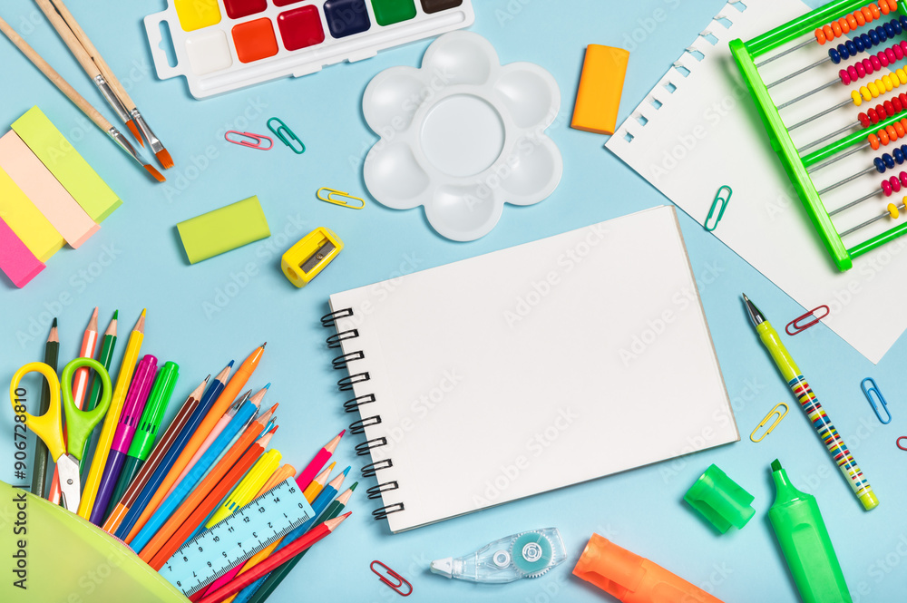Back to school concept. School colored stationery in pencil case, open notebook with iron spring and children's abacus on blue background. Workplace organization.