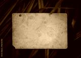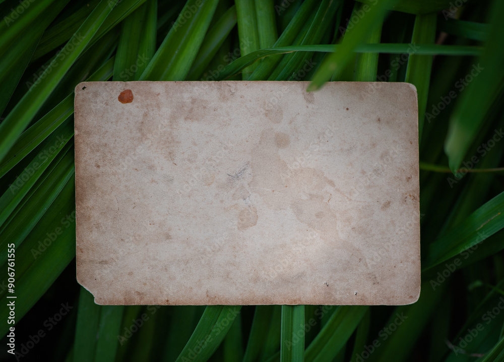Vintage empty paper lies on green leaves of a plant, creating a rustic and natural background