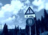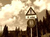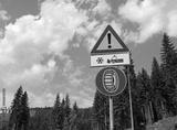 sign indicating the mandatory use of snow chains and snowplow in operation on a mountain road