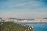 View of Istanbul skyline from Buyukada Island, with the sea and greenery in the foreground, under a blue sky