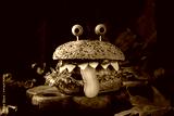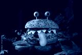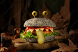 Funny Halloween Monster burger for children party. Black charcoal buns, cheese, chicken burger, cheese, letttuce, tomato sauce. Autumn leaves background.