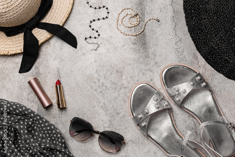 Woman summer accesories for vacation, travel on a stone grey background. Straw hat, sunglasses, sandals, pearl necklace, lipstick, clothes, dress. Top view, flat lay. Copy space.