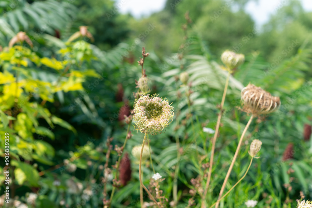 defocused field with wild carrots and other plants in summer