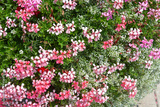 cascading flowers (perhaps a geranium cultivar) in a oversized sidewalk planter in the city