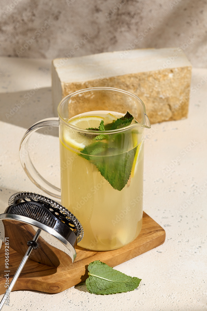 Refreshing Lemon, Mint, and Ginger Tea in a Clear Glass Pitcher