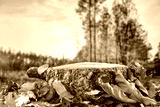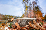 Autumn composition on a wooden tree trunk pedestal with copy space for products. Autumn leaves of trees in the forest background.