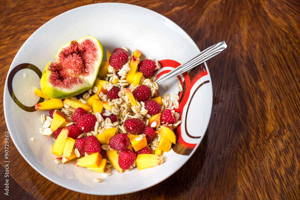 Oatmeal porridge in bowl topped with fresh raspberries, peach and fig on a wooden table with copy space