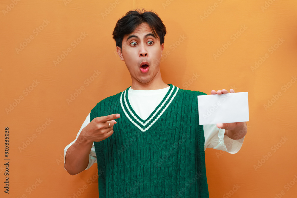 Young Asian man with happy wow face and wearing green sweater posing holding blank white paper for advertisement and pointing with hand finger isolated on orange background