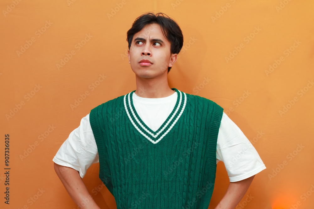 Happy young Asian man in green sweater posing thinking of a brilliant idea with excited gesture isolated on orange background