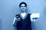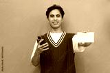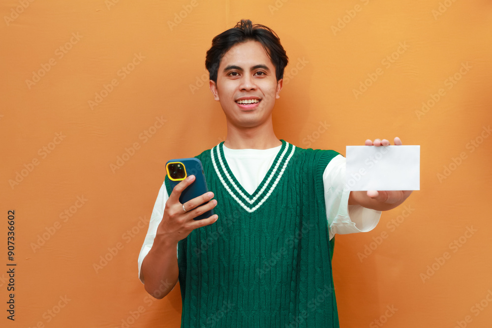 Happy Young Asian man in green sweater posing holding mobile phone and showing blank white paper for advertisement at camera isolated on orange background