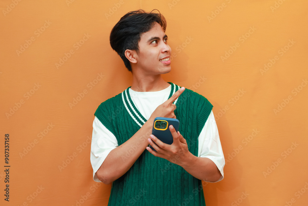 Happy Young Asian man in green sweater posing holding mobile phone and pointing with finger