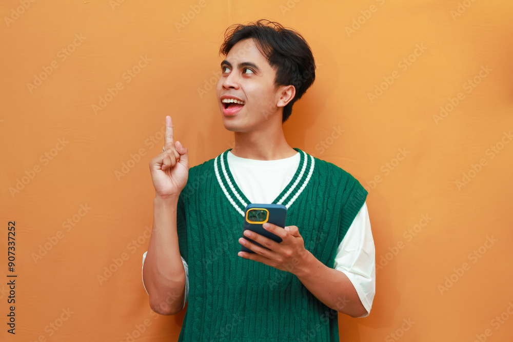 Young Asian man in green sweater posing holding mobile phone with gesture of thinking of brilliant idea