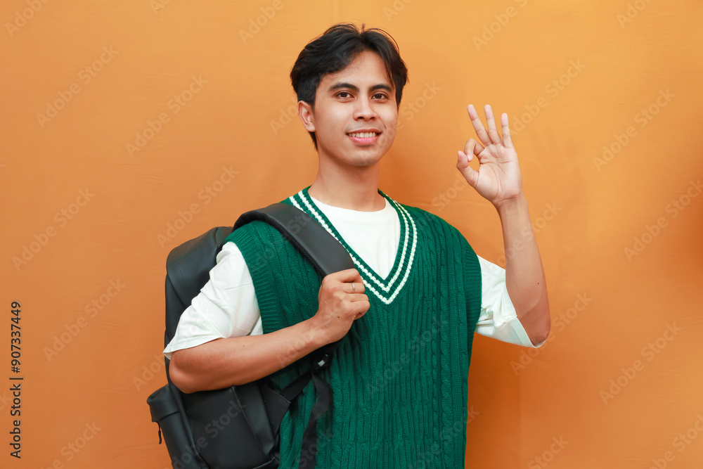 Happy Young Asian student in green sweater posing carrying backpack and making OK sign with fingers on orange background