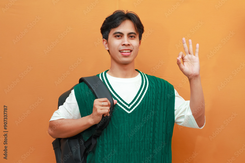 Happy Young Asian student in green sweater posing carrying backpack and making OK sign with fingers on orange background