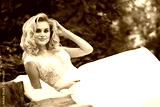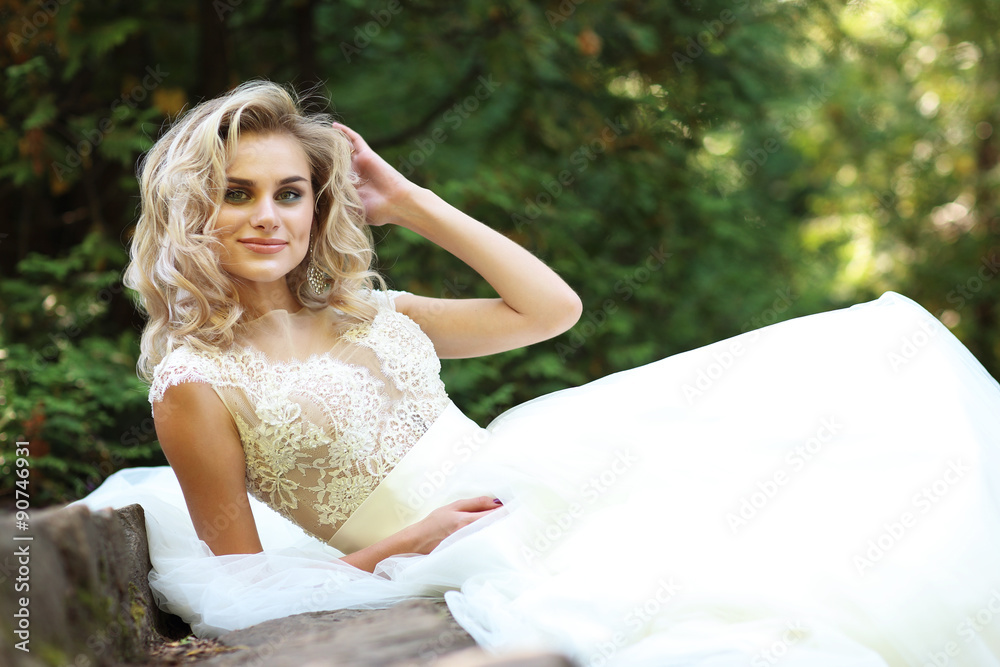 Beautiful bride posing outdoor. Wedding dress, curly blond hair.
