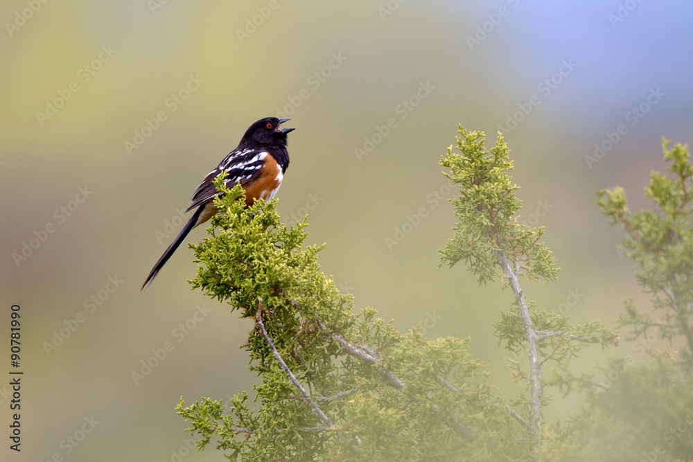 Spotted Towhee sings in a juniper tree in New Mexico