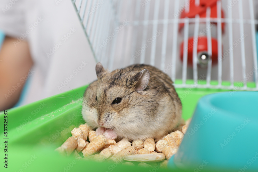 Hamster eats rodent food, pet enjoying grain and seeds, home comfort and fun.