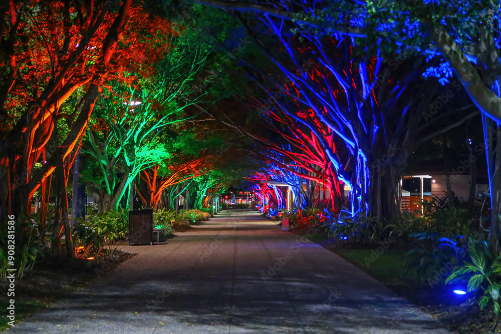 Illuminated colorful pedestrian street flanked by trees on the Cairns Esplanade in northern Queensland, Australia