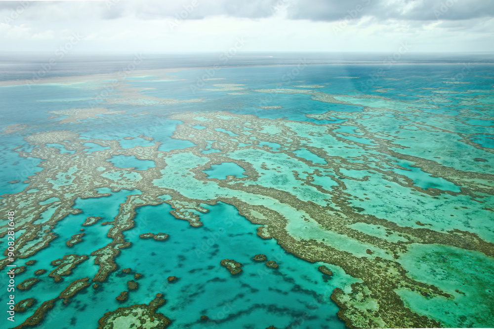 Aerial view of the Hardy Reef in the Great Barrier Reef, the world's largest coral reef system located in the Coral Sea, off the coast of Queensland, Australia