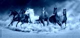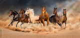 Horse herd run in desert sand storm against dramatic sky