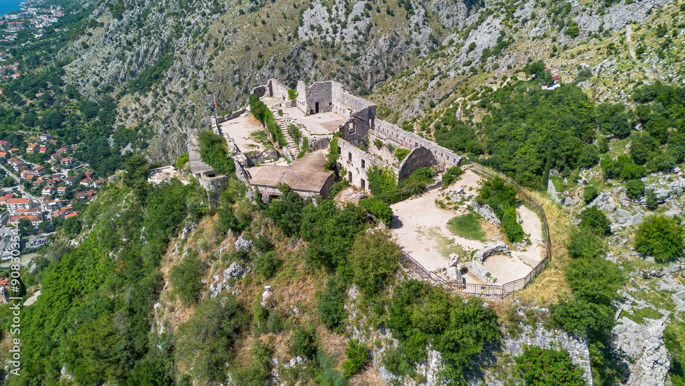 Aerial view of the fortress of San Giovanni (Saint John) built on a rocky outcrop above the old town of Kotor in Montenegro - Medieval ruins overlooking the bay of Kotor