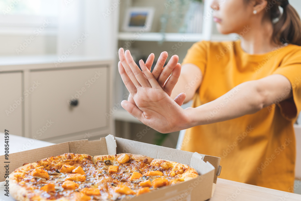 Diet concept, unhappy asian young woman, girl refusing to eat Pizza in box at home, hand pushing away, deny junk or fast food, fighting to keep it from getting fat. Healthy nutrition of weight loss.