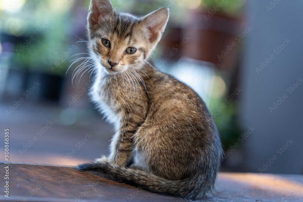 Portrait of cute gray tabby kitten sitting on summer terrace of cottage, head shot, looking into camera