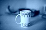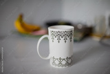 white porcelain mug with coffee on kitchen counter. Banana and fruits in the background
