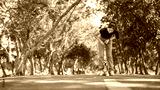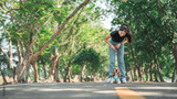 Asian owner and his beagle dog is having fun while walking in dog park in morning summer, Dog training, copy space