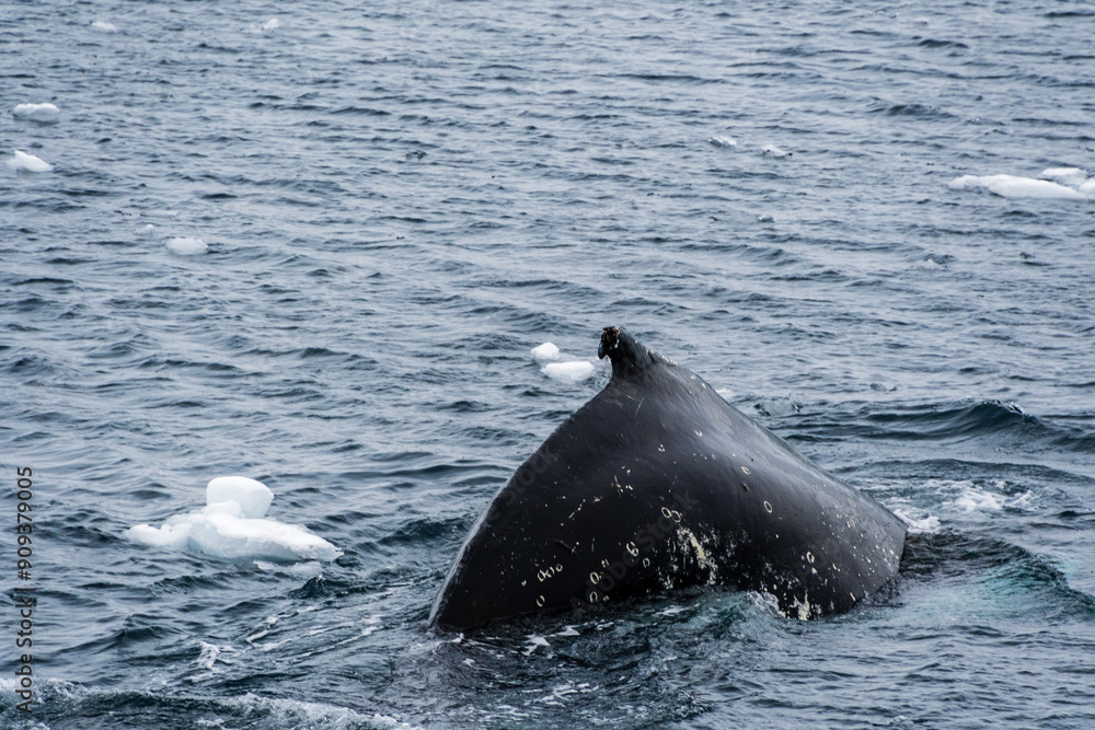 Close-up of the back of a diving humpback whale -Megaptera novaeangliae- including the dorsal fin and blow hole. Image taken inear the entrance of the Lemaire channel, in the Antarctic peninsula.