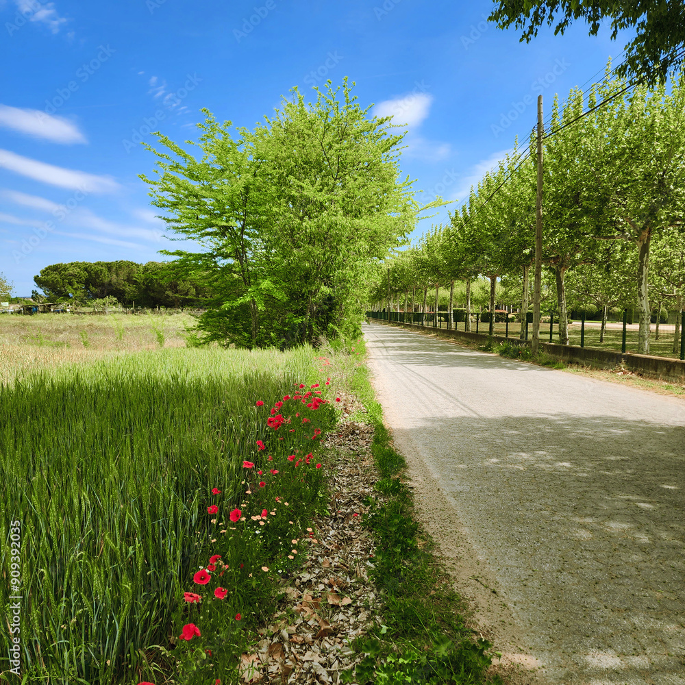 Rural landscape. Road along a field with ripening wheat and wild flowers. Blue spring sky. Meadows. Sunny, beautiful day.