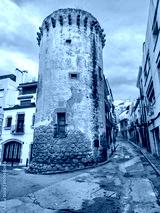 Narrow streets of the old town. Beautiful colorful facades with gates and balconies. Arenys de Mar. Catalonia. Spain.
