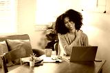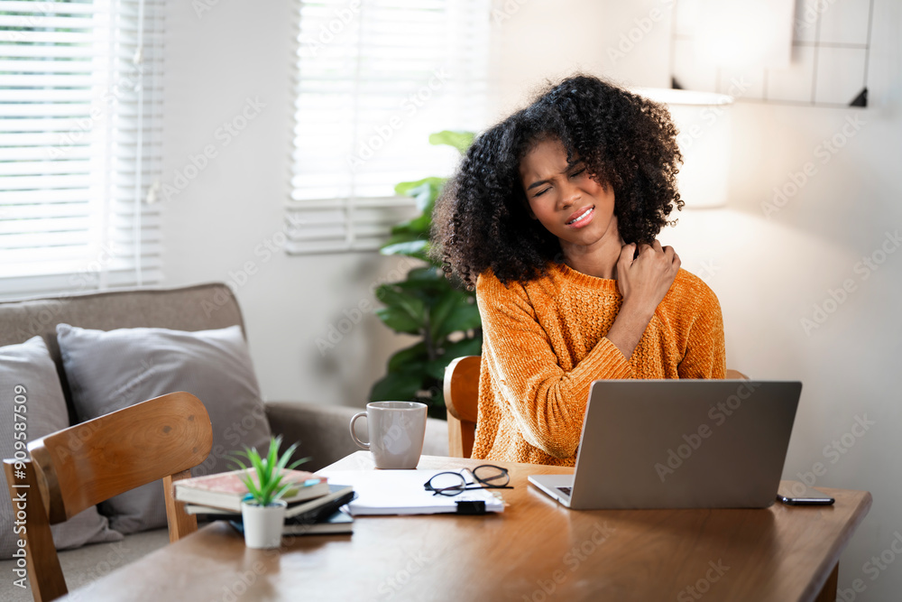 Overworked young Black businesswoman is massaging her neck, sitting at home office, experiencing neck pain, and feeling exhausted during work.