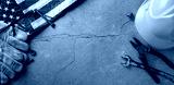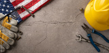 Labor Day concept showcasing various tools, safety gear, and an American flag on a concrete background