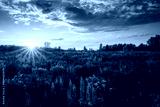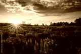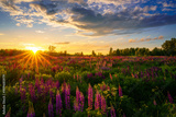 Sunrise or sunset on a field with purple lupines on a cloudy sky background in summer.