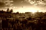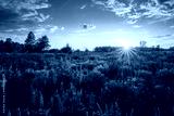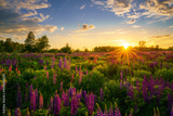 Sunrise or sunset on a field with purple lupines on a cloudy sky background in summer.