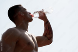 A shirtless, fit man with a muscular build replenishes hydration by drinking from a water bottle against a clear sky backdrop, emphasizing health and fitness concepts.