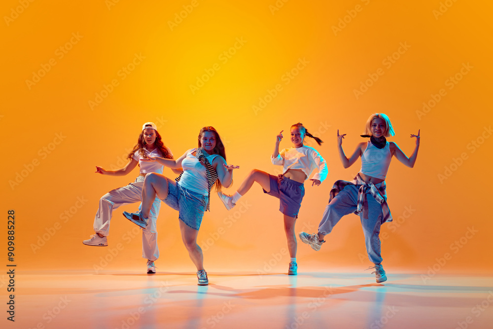 Dynamic photo of young energetical women quartet performing in vibrant neon light against gradient studio background. Concept of music, fashion and art, retro and modernity, movement, sport and hobby.