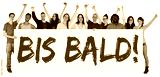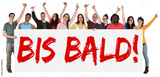 Bis bald Abschied Schild Laden Geschäft Gruppe lachen junge Leu