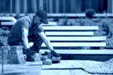 Man Laying Pavers in Modern Garden During Bright Daylight