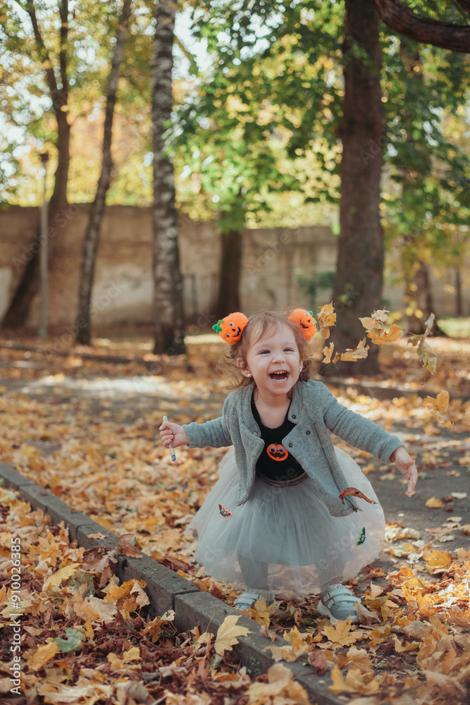 Young girl throw autumn leaves dressed in Halloween costumes during Trick-or-Treat