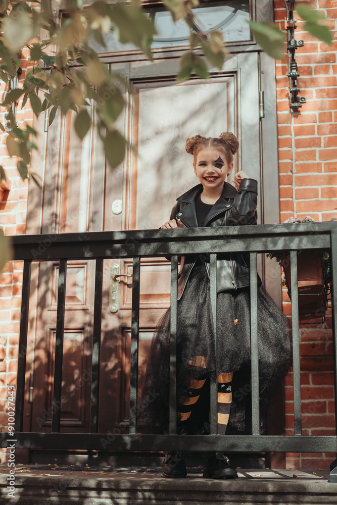 Young girl dressed in Halloween costumes during Trick-or-Treat