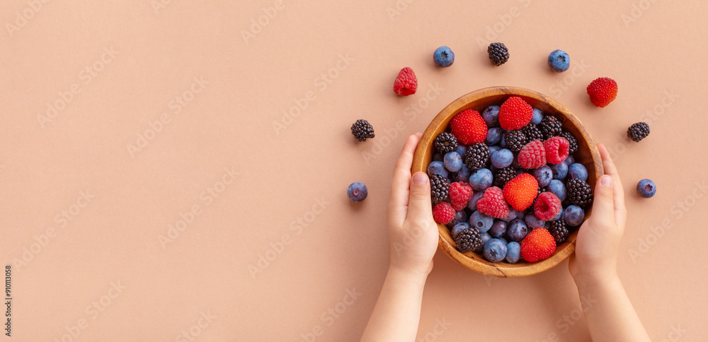 Child hands holding bowl of fresh summer berries on beige background top view. Organic and nutritious snack or dessert for healthy lifestyle.