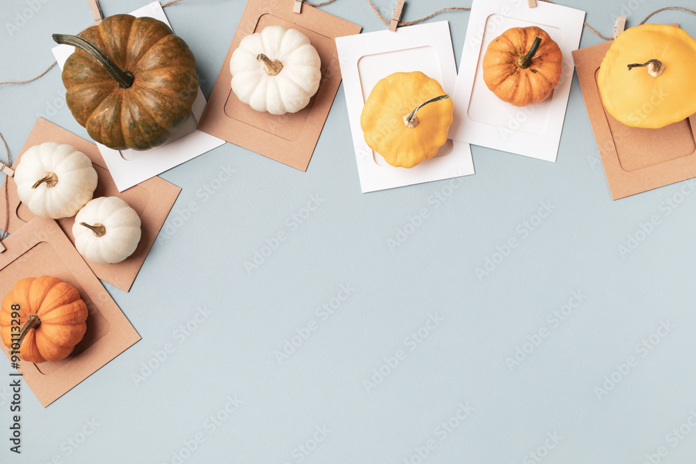 Happy Thanksgiving holiday background from autumn decorative pumpkins on blue table top view.