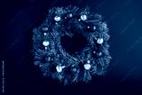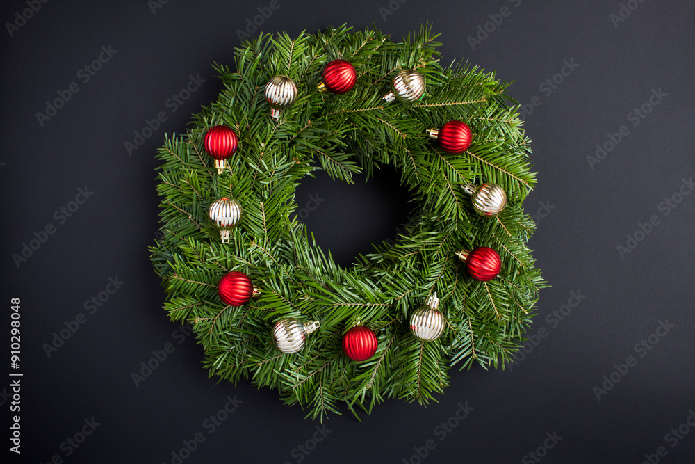 Christmas wreath with red and gold beads on the black background. Top view. Close-up.