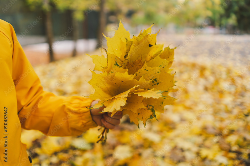 A young child dressed in a bright yellow jacket gathers a variety of colorful autumn leaves and chestnuts into a woven basket. The woodland floor is blanketed with fallen leaves