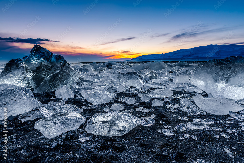 Icebergs at sunset, Jokulsarlon ice lagoon in Iceland